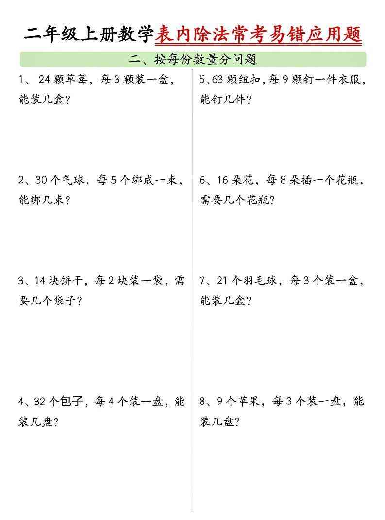 | 二上数学表内除法常考易错应用题(共6页含答案) | |