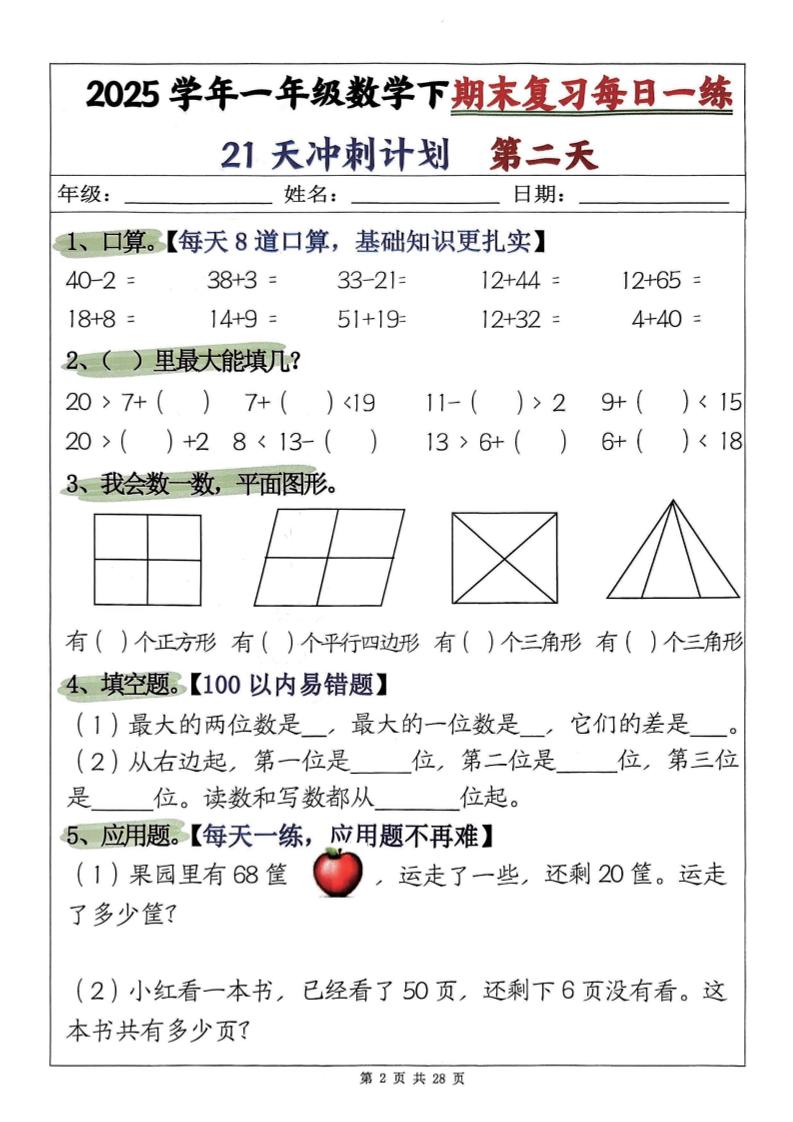 ⏰ 一键快速下载!一年级下册数学期末复习21天冲刺计划🔥|每日一练+专项突破+真题模拟,让孩子稳扎稳打冲刺满分!限量内部资料,错过再无!极速保存,立即开启高效复习! | |