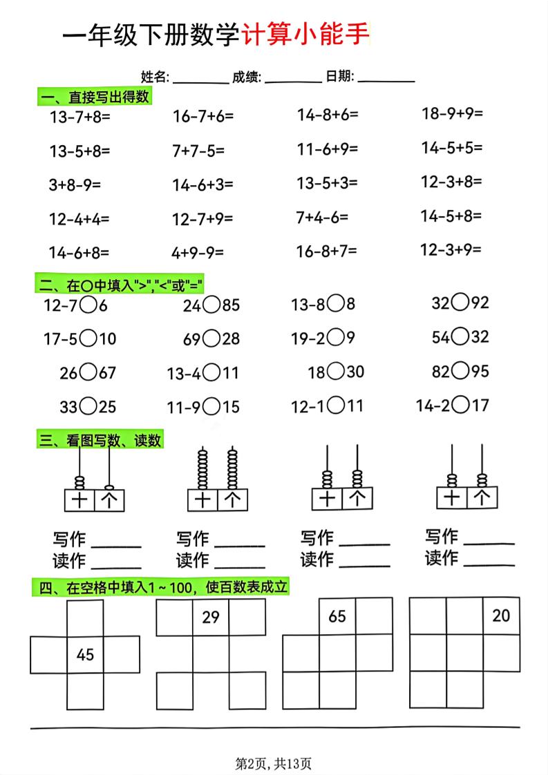 一年级下册数学计算小能手综合练习(全100题)— 每天练一练,基础稳又快! | |