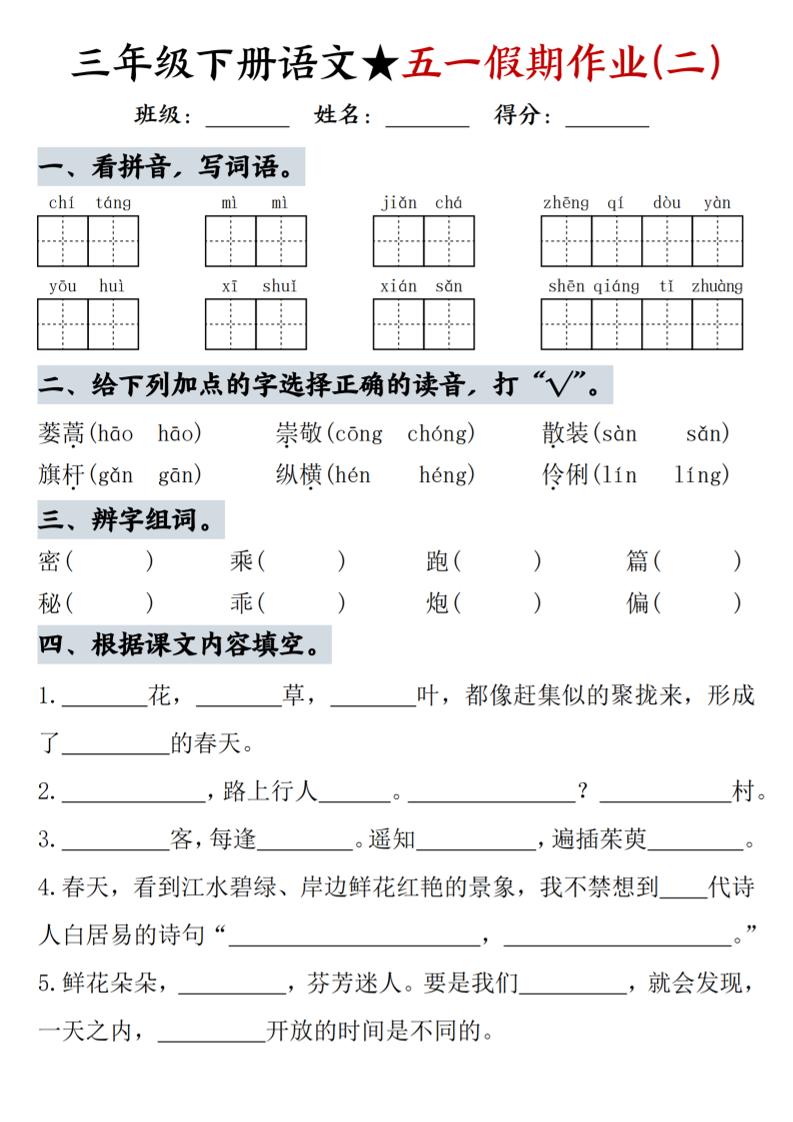 三下语文五一假期作业 — 全科解析版(可一键下载打印) | |