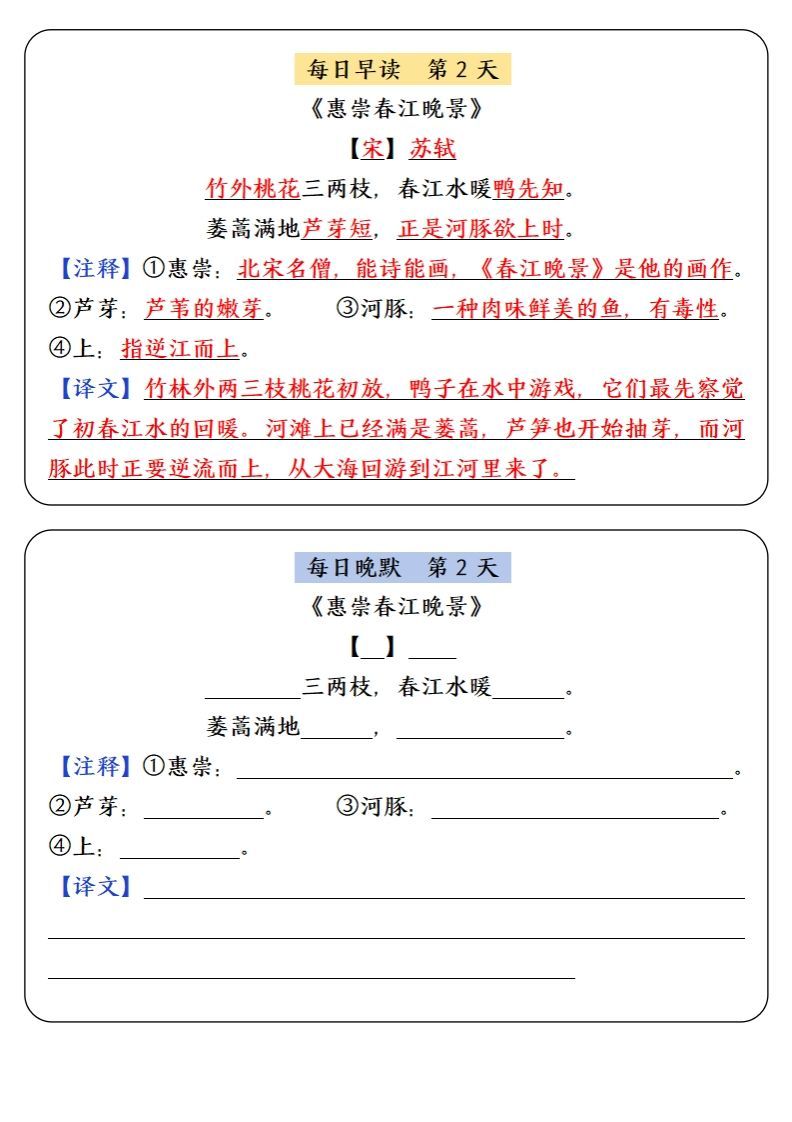核心亮点 | ✅ 同步部编版三下语文教材,精准标注寒假必背古诗词+课文重点段落 ✅ 每日早读晚默科学规划表,清晰标注晨读任务+晚默检测时间 ✅ 配套背诵技巧口诀+记忆思维导图,5分钟记牢1课内容 ✅ 一键下载高清PDF版,随时打印,家长辅导无忧 |