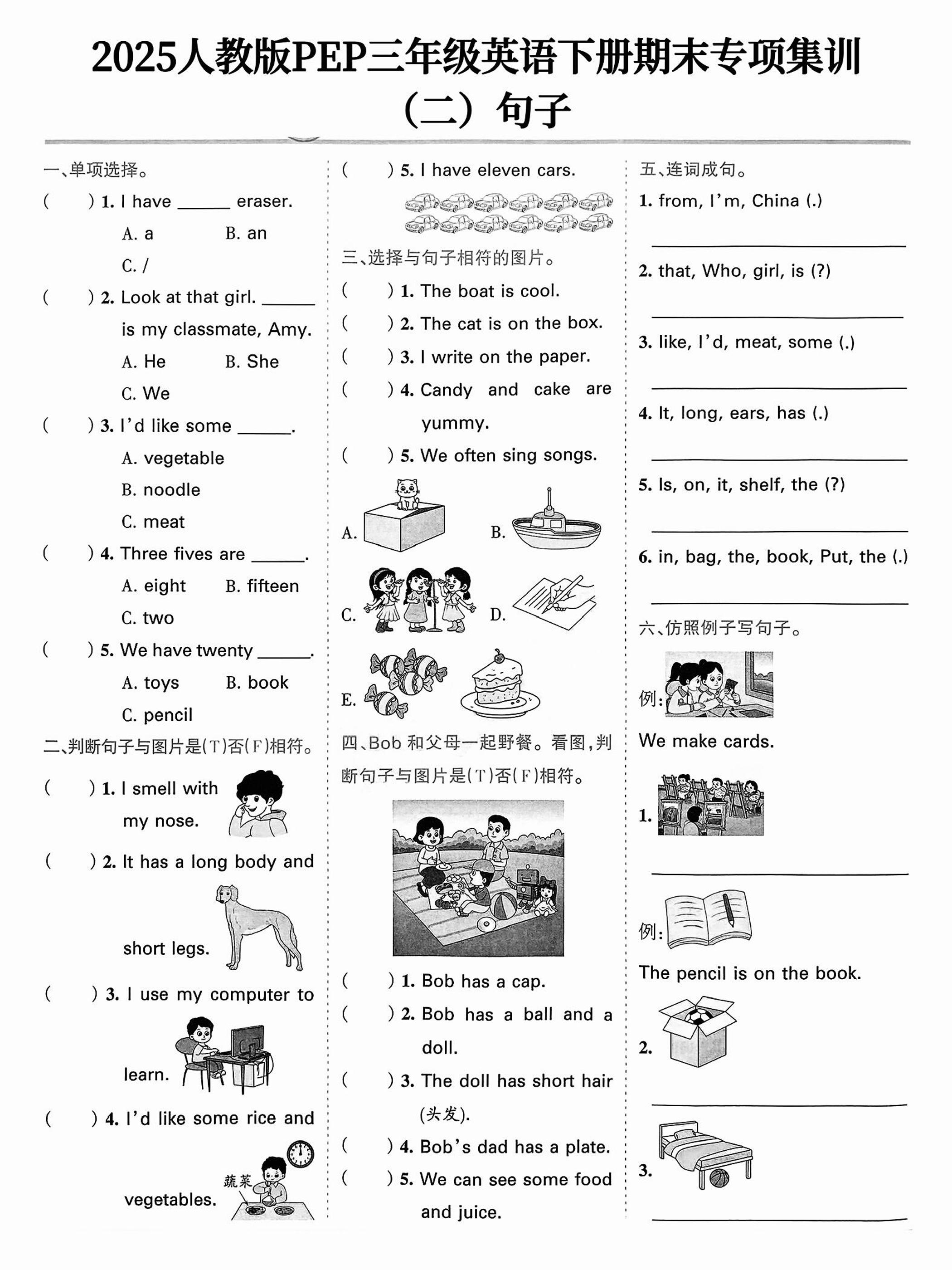 内容维度 | 本资料针对2025年人教版PEP教材三年级下册学生期末英语复习场景设计,覆盖听力理解、词汇运用、语法巩固、阅读理解、情景对话、写作基础及综合应用七大核心专项,每专项均配套分层梯度训练题,8页答案详解包含听力原文转写、易错题解析及口语表达参考范例,兼顾新课标倡导的“用英语做事情”核心素养培养。 |