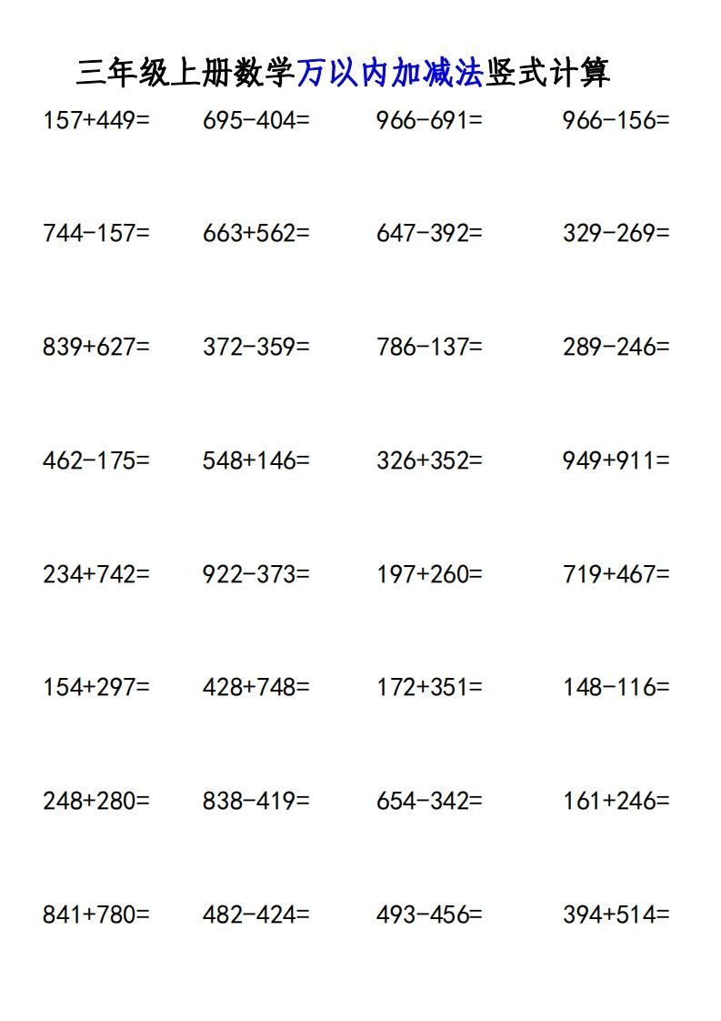 资源亮点 | ✨ 同步人教版三年级数学上册教材,精准对应万以内加减法竖式计算重点难点! ✨ 1000+道精选竖式计算题,含进位、退位、不进不退混合训练,逐步提升难度! ✅ 一键快速保存高清PDF版,支持手机/平板/电脑随时打印练习! ✅ 每题配详细答案解析,扫码即刻下载,告别手抄耗时! |