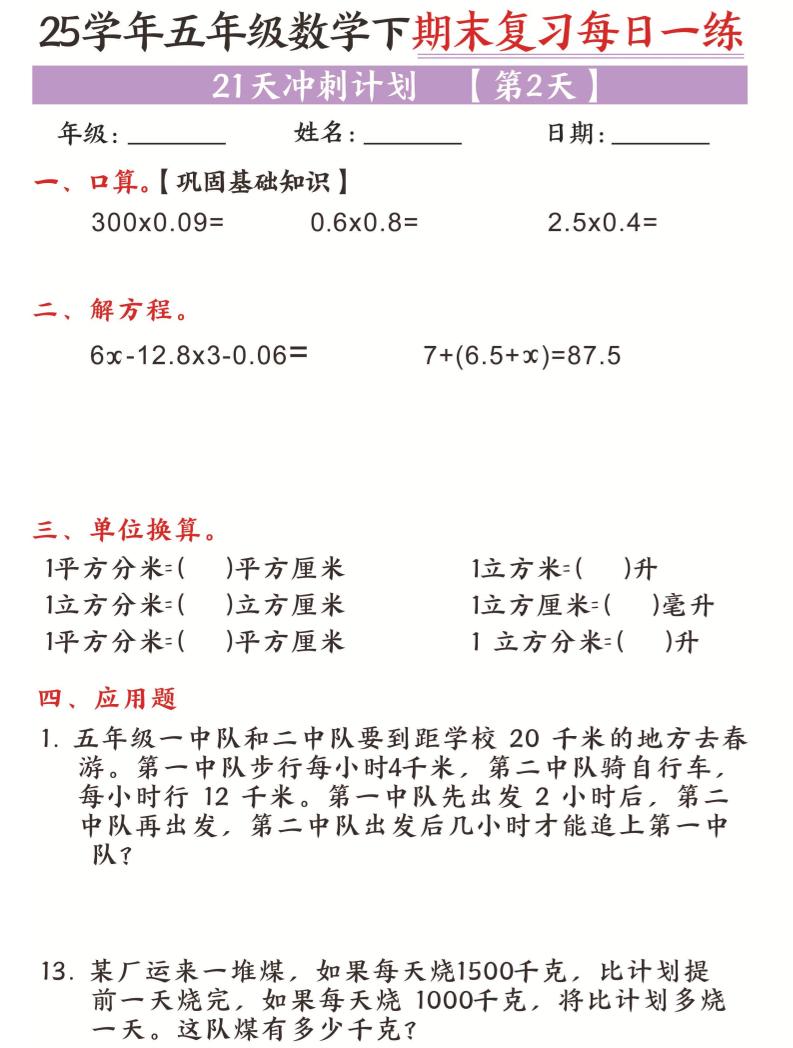核心用途 | 针对五年级下学期学生数学期末复习需求,通过21天每日15-20分钟定向练习,系统梳理单元核心知识点(如图形运动、分数运算、统计与概率),强化知识连贯性,同步匹配新课标中“运算能力”“推理意识”等核心素养要求,帮助学生实现从“单知识点掌握”到“综合应用掌握”的递进。 |