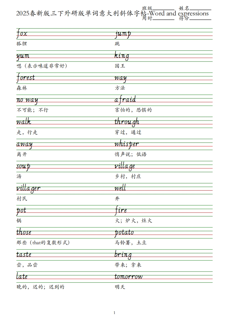 维度 | 本外研版三下英语单词意大利斜体字帖(2025春新版)以新课标核心素养为导向,聚焦语言能力与文化意识培养。其核心用途在于通过规范书写强化单词记忆,辅助娃在小学阶段夯实英语书写基础——意大利斜体格式贴合国际通用书写规范,可直观提升字母形态认知与连贯书写能力,同时配套Wordandexpressions资源(如趣味联想词表、场景化例句),帮助娃将机械记忆转化为灵活运用。特点上,新版严对标2025新课标要求,删除陈旧表达,更新生活化词汇(如“digital life”“green travel”),斜体设计兼顾美观与实用性,通过字母弧度、倾斜角度的视觉引导,降低书写入门难度。价值层面,字帖不仅是书写工具,更是文化渗透载体:意大利语系书写习惯隐含欧洲文化符号(如e/i上浮、o末端圆弧),娃在临摹中潜移默化感知多元文化,契合“用英语讲好中国故事”的课标延伸目标。对家长而言,需理性看待“书写规范”的重要性——避免盲目追求速成,应结合日常作业与字帖练习,关注娃的握笔姿势、字母比例等细节;选择新课标配套教材的字帖,能更好衔接课堂学习,让书写训练从“额外任务”变为“学习刚需”,真正实现“以字促学,学用结合”。 |