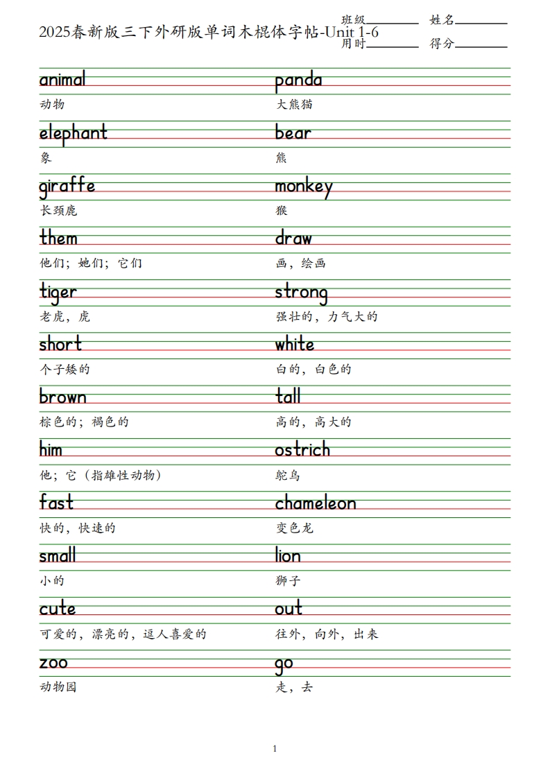 用途 | 契合2025新课标”语言运用为核心”要求,聚焦外研版三下英语Unit1-6高频单词,通过系统书写训练强化词汇记忆与规范表达,解决低段学生因笔画生疏导致的书写不工整、结构不规范问题,为后续口语交流与书面写作打下基础。 |