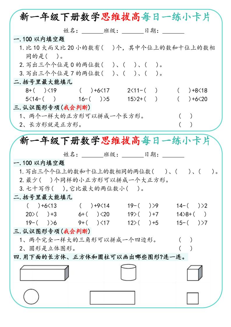 新一年级下册数学思维拔高每日一练小卡片15页(可打印PDF)— 一键快速下载,立即开启高效训练! | |