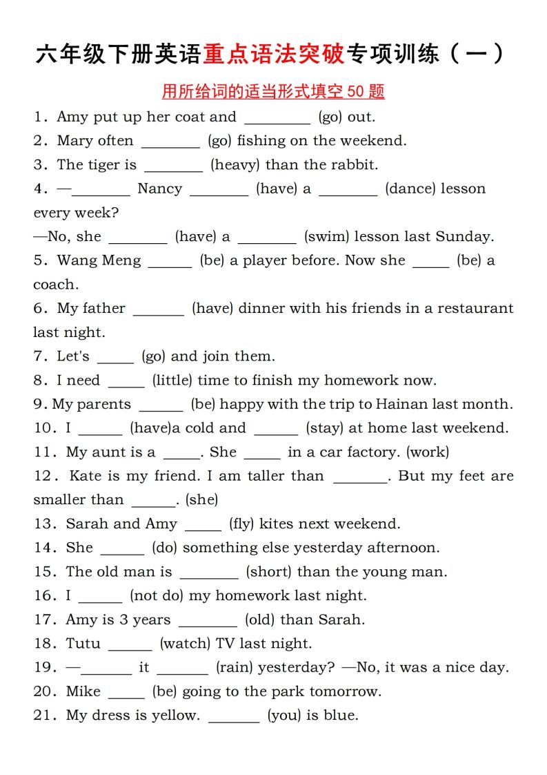 六年级下册人教PEP英语重点语法突破专项训练(一)——完形填空(带答案解析) | |