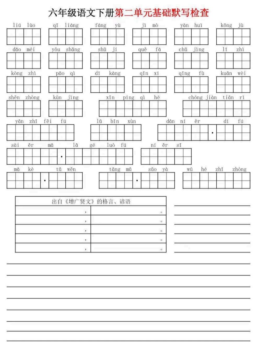 📌核心优势 | ✅ 严格对照六年级下册语文教材单元目录 ✅ 每一课古诗词+日积月累精准默写清单 ✅ 重点字词+易错字标注+拼音注释 ✅ 一键保存PDF可打印,随时背诵不迷路! |