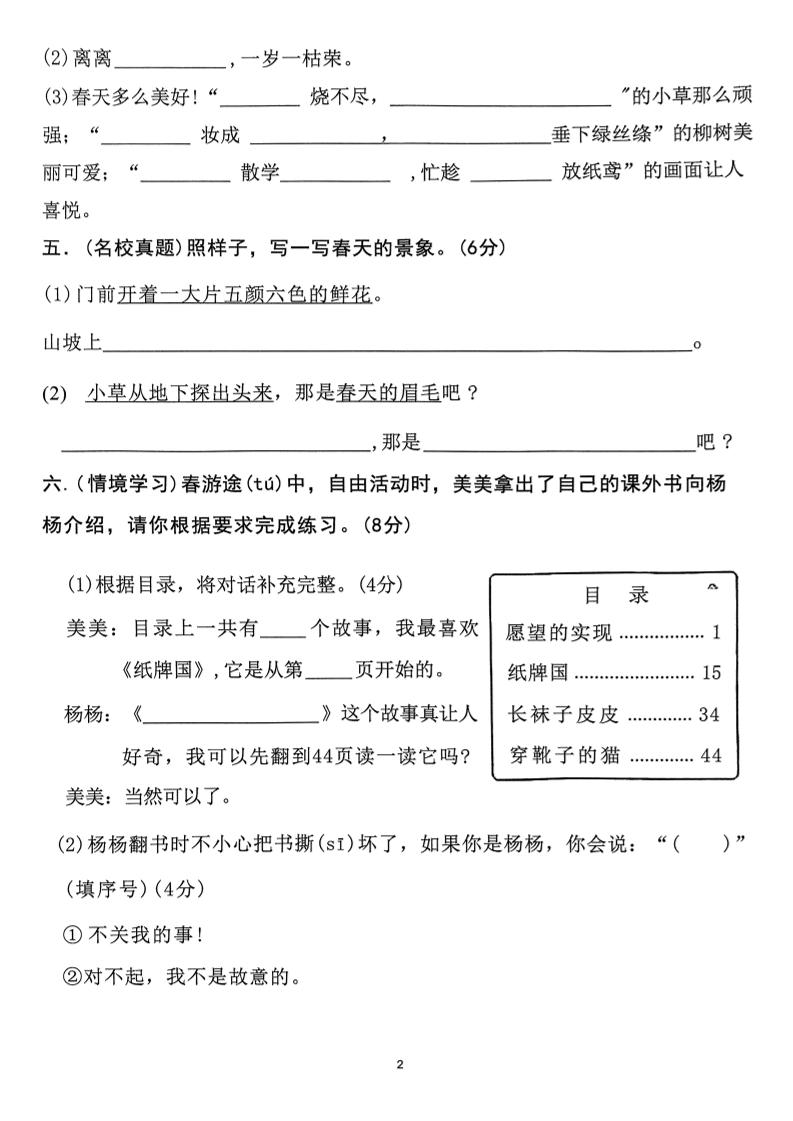 主要内容和结构本测试卷针对二年级下学期的八个单元内容,结合语文新课标要求,设计了基础知识、阅读理解、写作表达等多个板块,旨在全面考察学生的综合语文能力。 |