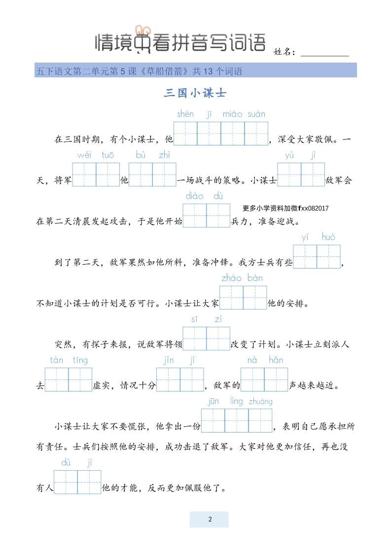 本资料为2025春季五年级下册语文配套练习册,聚焦”情境中看拼音写词语”核心功能,贴合2025新课标”语言积累与梳理”学习任务群要求,通过真实情境创设(如校园活动、家庭生活、自然观察等场景)引导学生关联拼音规则与词语运用,有效巩固声形对应、字义辨析等基础能力。其特点在于梯度设计科学,采用”基础词-拓展词-情境词”三阶排列,配套生动插图降低畏难情绪;同时强化互动属性,可结合教师讲解、亲子竞赛、自主书写等多元形式完成。\n |