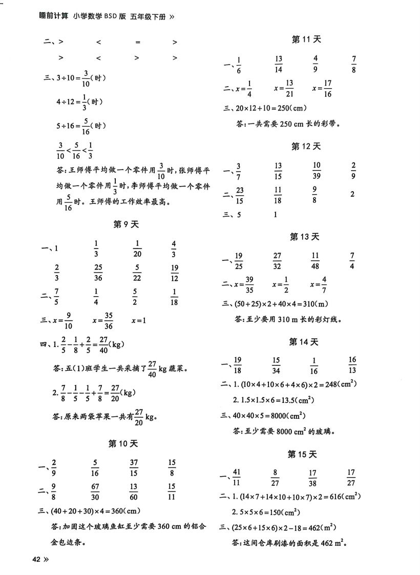 用途 | 本答案材料作为北师版五下数学课后巩固工具,适用于每日10分钟计算专项训练,帮助学生同步掌握课堂核心内容(如分数意义、长方体表面积/体积等),通过渐进式练习强化计算准确性,逐步形成稳定的基础运算能力,适配新课标强调的“学科实践”与“跨学科主题学习”要求。 |