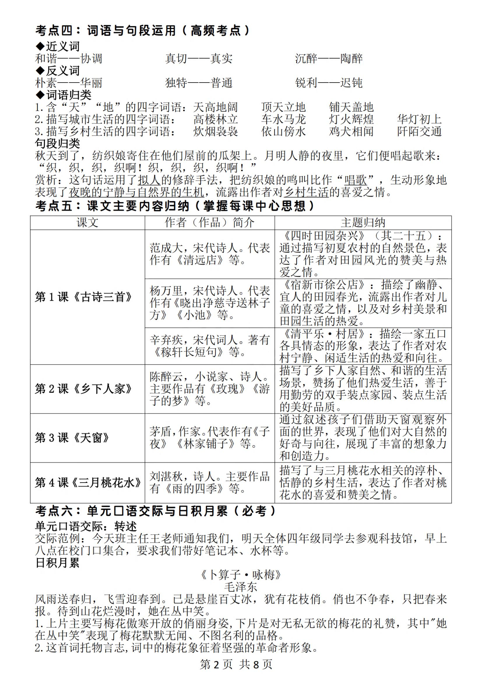 四年级下册语文期中地毯式复习重点(8页精编)》——期末冲刺抢分秘籍 | |