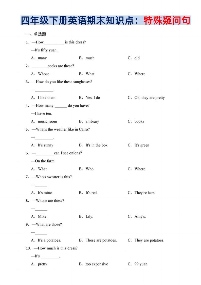 一键快速下载,四年级下英语期末疑问句知识点训练《PEP版》(含答案解析) | |