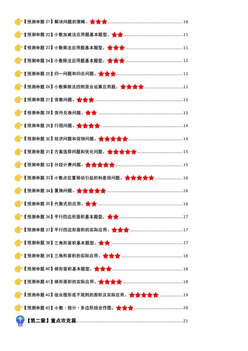 内容优势 | 🔹 小数四则混合运算强化训练,熟练冲刺满分! 🔹 多边形面积综合应用题精讲,攻克图形难点! 🔹 简易方程+解决问题专项突破,掌握高分套路! 🔹 重点统计与可能性压轴题解析,精准预测考点! |