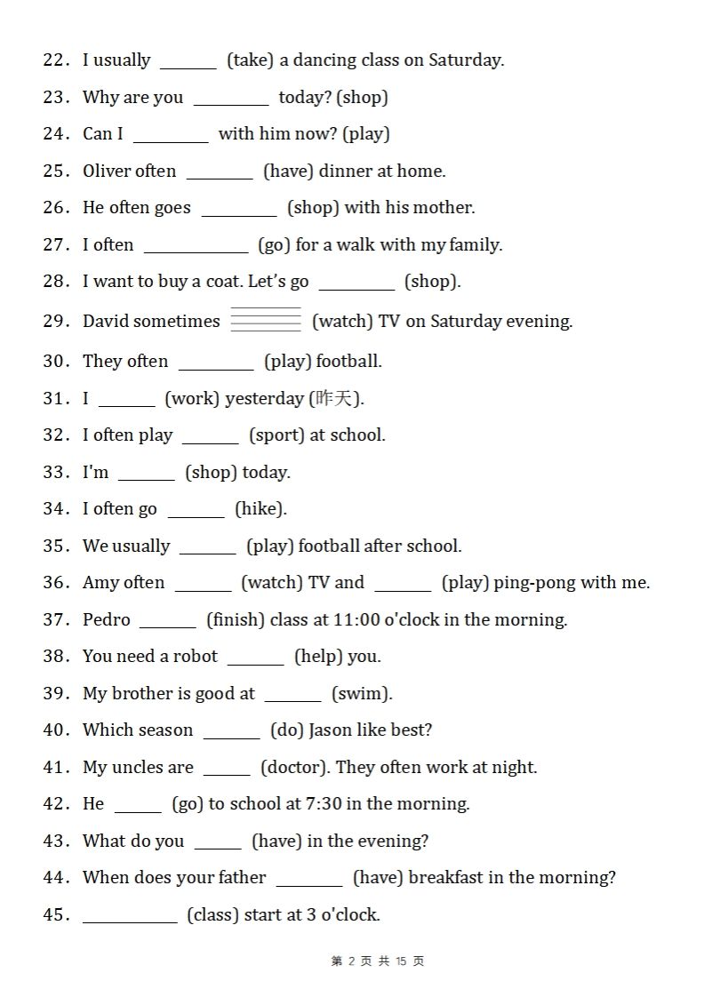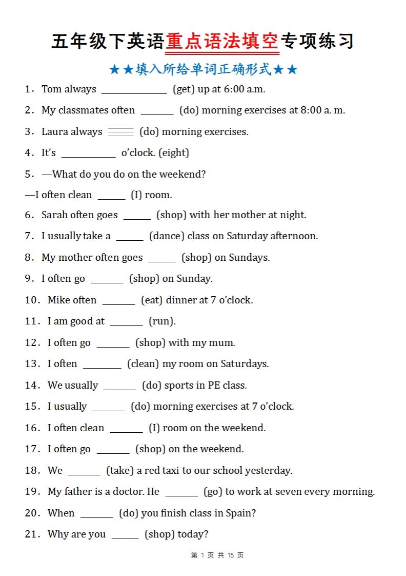 五下英语人教PEP重点语法填空专项练习(可打印版) | |