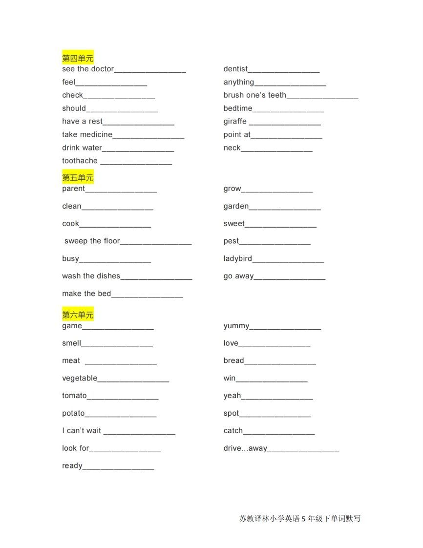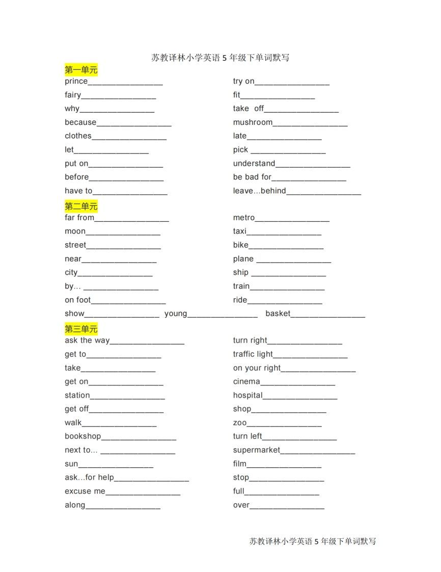 五下英语默写《单词默写》译林版(完整版可打印) | |