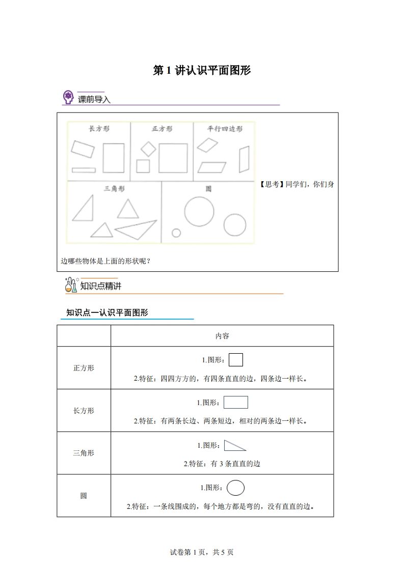 资源亮点 | ✅ 同步人教版教材,精准匹配1-1课时内容! ✅ 基础图形识别练习题,边看边练不枯燥! ✅ 高清PDF无水印打印,一键保存随时学! |
