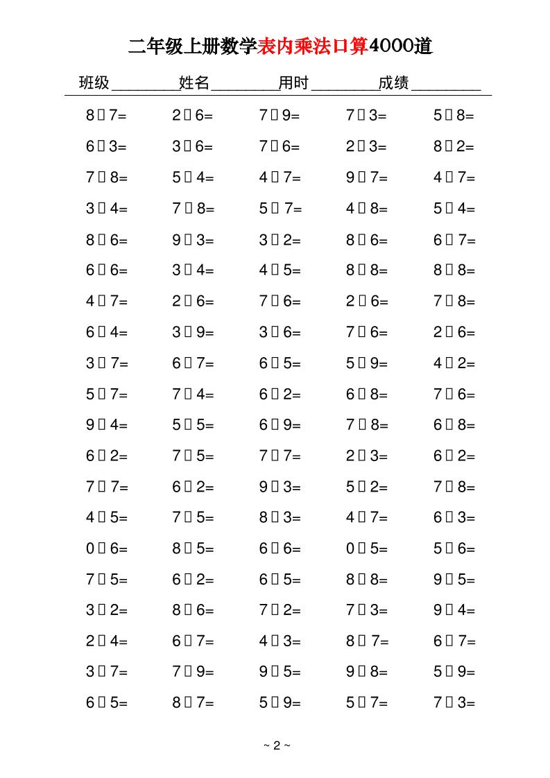 | 二年级上数学表内乘法口算4000道(40页完整版) | |