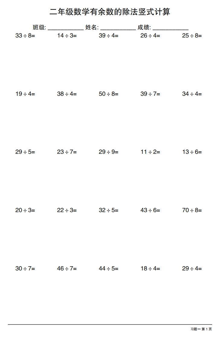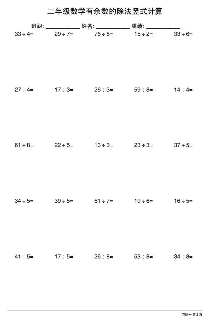 二下数学有余数的除法竖式计算40套(带答案)|可下载可打印|小学2年级配套练习题 | |