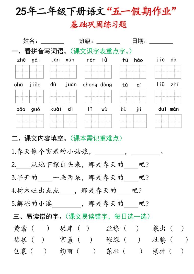 | ⏰ 限时免费下载!二下语文五一基础巩固作业,点击一键保存,让孩子假期领先一步! | |