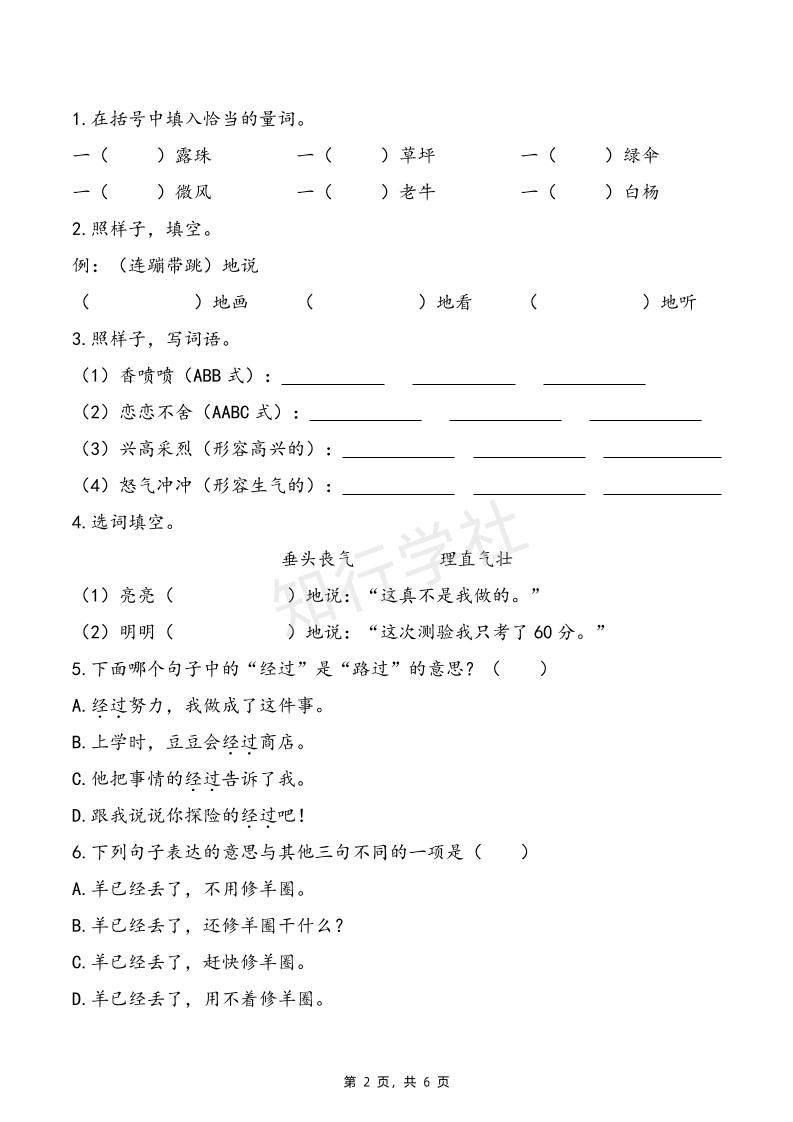 | 资源亮点 | ✅ 人教版二年级下册语文专项训练,精准匹配教学进度 ✅ 五一假期专属练习题,含完整答案解析共6页,便于自查 ✅ 一键快速下载,原版高清PDF可立即打印,孩子抢跑不累 ✅ 作业+复习两用,覆盖看图写话、词语积累、阅读理解、语法应用等核心模块 |
