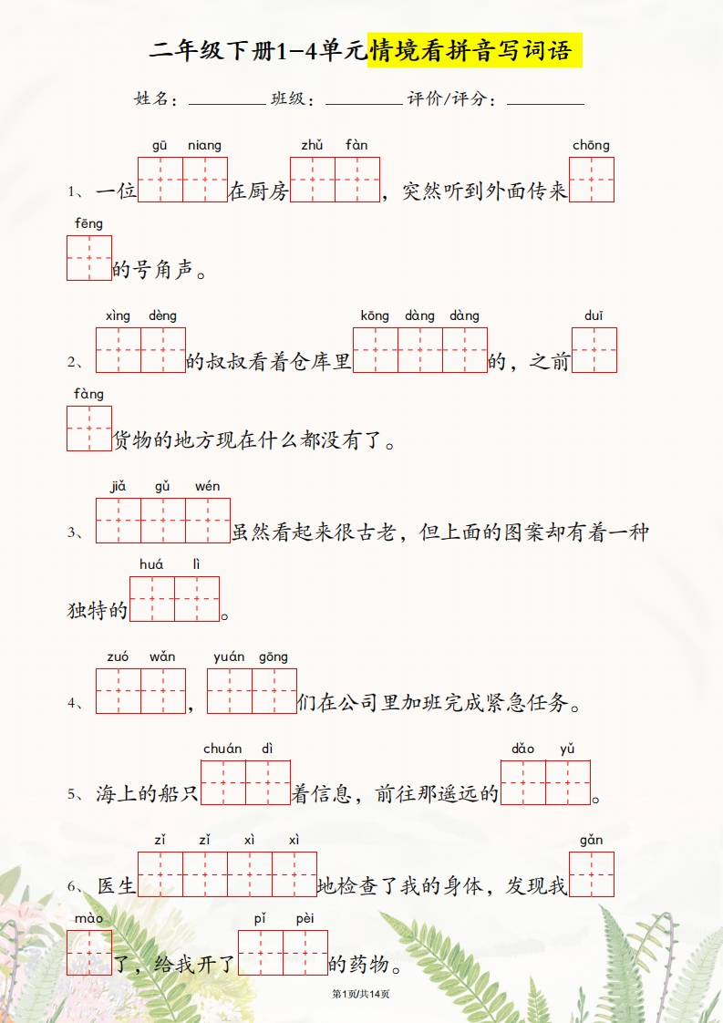 | ✅ 一键保存高清版,二年级下册语文1-4单元情境看拼音写词语!形象图+拼音组词全收录,让孩子边看边练,识字更轻松!限时免费下载,抢先占据高效学习高地! | |