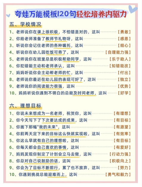 | ✨一键保存120句夸娃神句,用万能模式点燃孩子内驱力!告别吼叫式教育,巧用语言激发自信力与主动性,每天3分钟,夸出高成就动机!立即收藏,开启科学夸娃新时代! | |