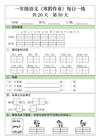 | 一键保存2025最新一年级语文寒假作业20天,每日一练稳步提升!高清电子版免费领取,下载即打印,让孩子假期学习不间断,赢在开学起跑线!立即点击获取,轻松完成每日作业任务! | |