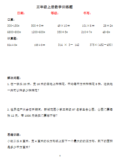| 2025最新寒假三年级上册数学训练题(新)|人教版|可打印PDF | |