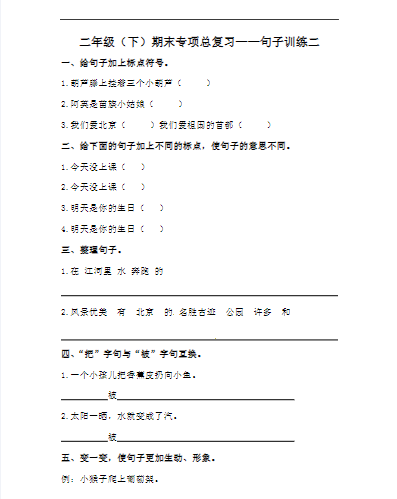 | 2下句子训练专项练习(37页)PDF高清可打印 – 一键快速下载,立即提升语文表达能力! | |