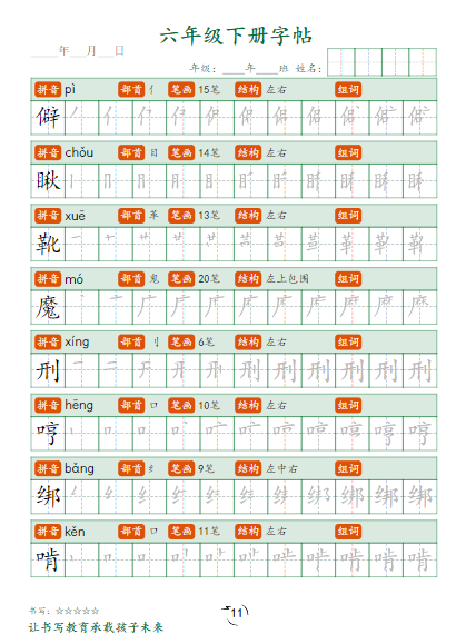 | 【15页】小学语文6年级下册笔顺同步字帖(完整版) | |