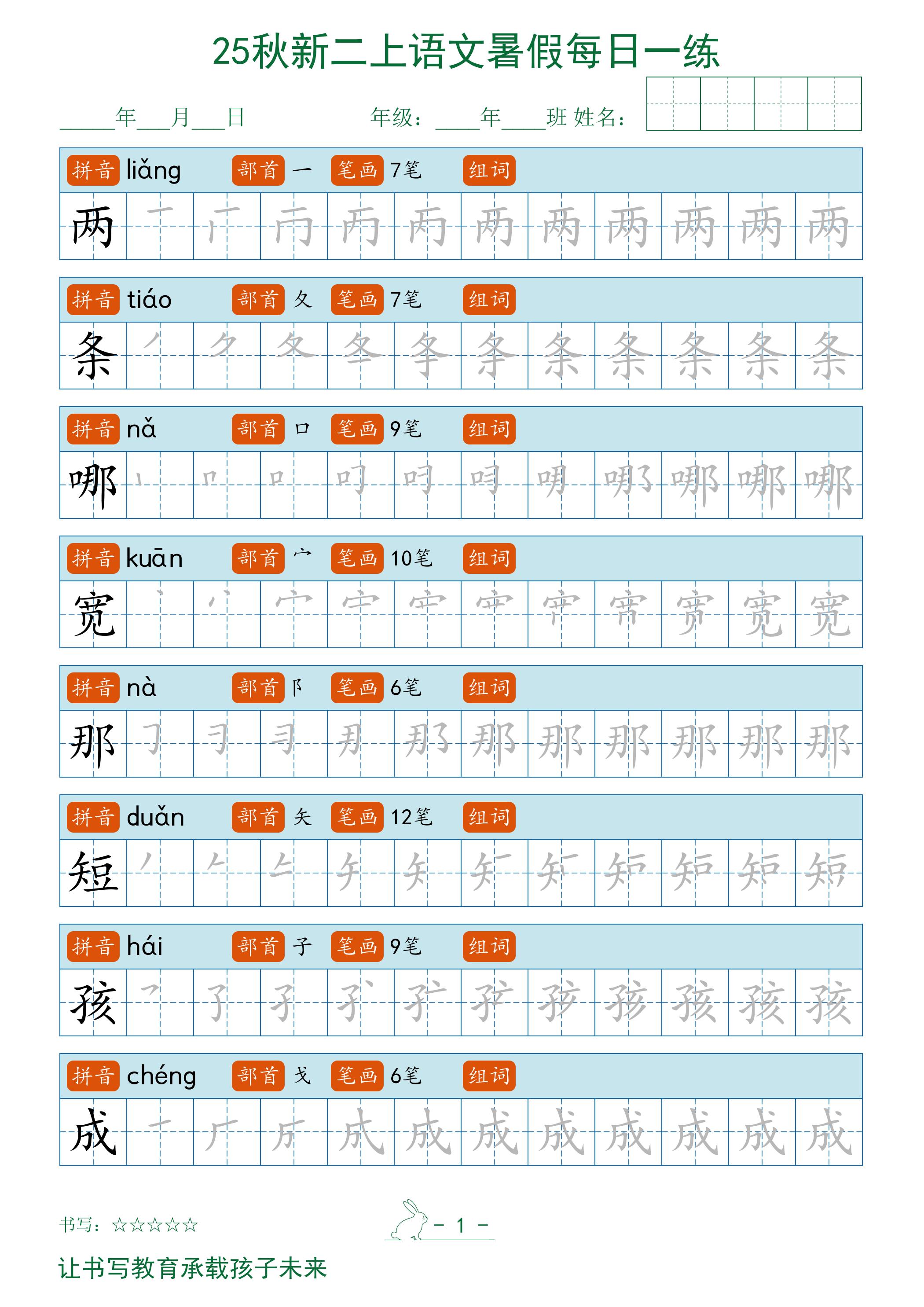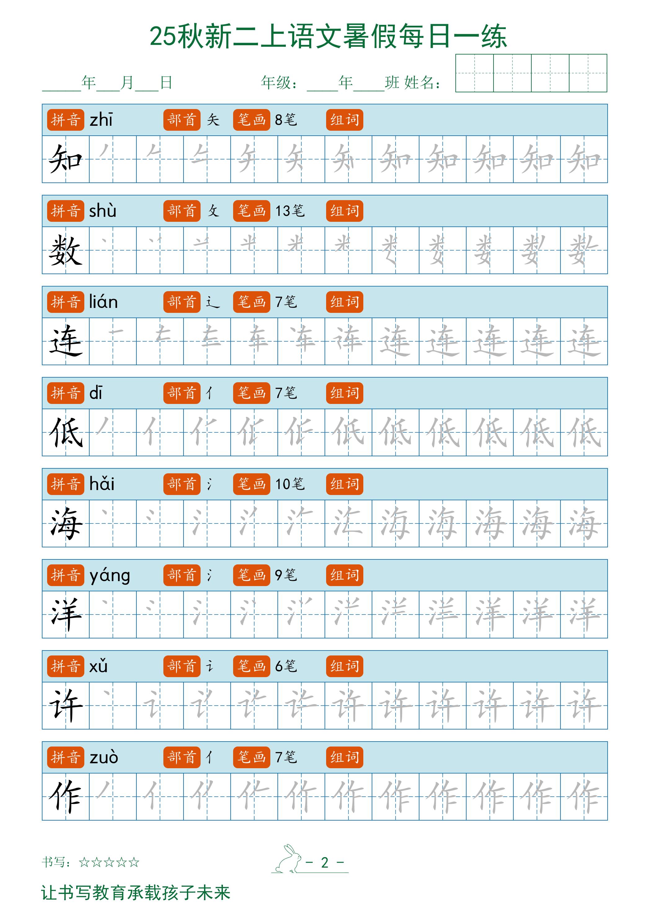 内容重要性 | 字帖在2025秋新二上语文暑假学习中意义非凡。击实语文基础知识,如字词的准确书写,为后续学习筑牢根基,是语文素养提升的首要环节。 |