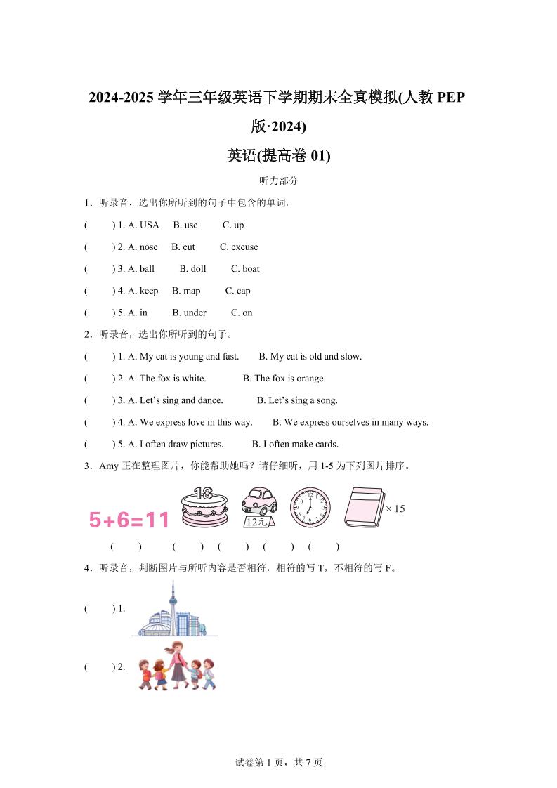 试卷定位 | 2024-2025学年三年级英语下学期期末全真模拟卷(人教PEP版),属于提高卷,严格对标2025新课标核心要求,聚焦学生核心素养(语言能力、文化意识、思维品质、学习能力),旨在检测学期阶段英语综合运用能力。 |
