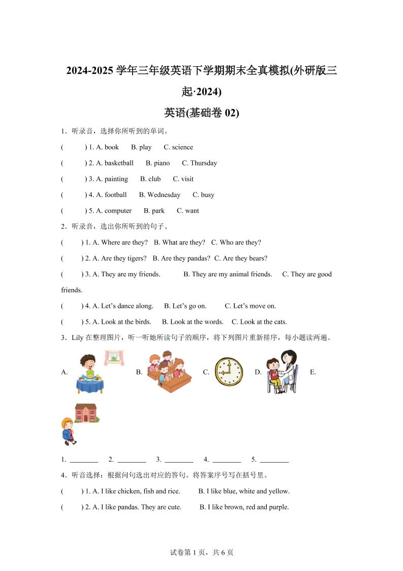 核心用途 | 本试卷作为2024-2025学年三年级英语下学期期末全真模拟题型,紧密贴合外研版三起教材编排,全面覆盖新课标要求的字母、词汇、句型及简单交际用语等核心内容,既能帮助学生检验阶段学习成果,提前适应期末考节奏与题型分布,也为教师提供教学反馈参考。 |