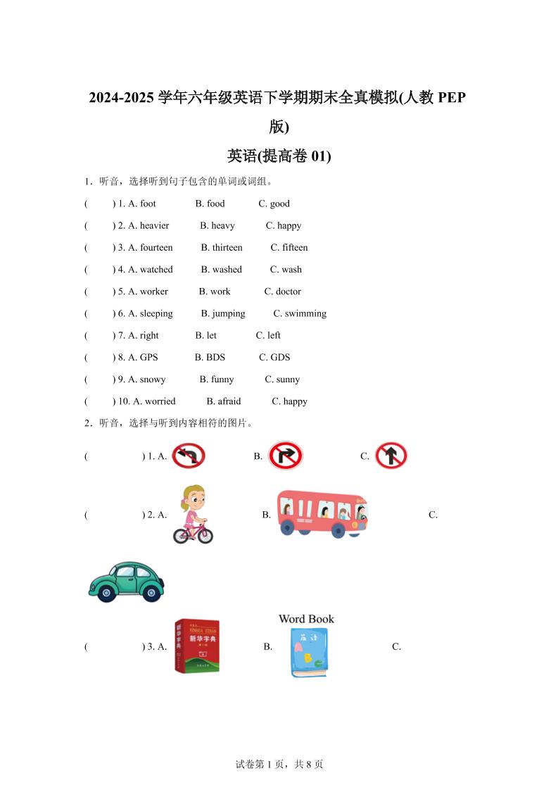 内容维度 | 本卷作为2024-2025学年六年级英语下学期期末全真模拟题(人教PEP版提高卷01),核心定位是短期备考用车,通过模拟真实考试场景,辅助学生检验新课标核心素养(语言能力、文化意识、思维品质、学习能力)的达成度,尤其适配五年级下册至六年级上册的重点知识(如一般过去时、现在进行时、场景区分等)及新增的“跨学科主题学习”任务型表达要求。 |