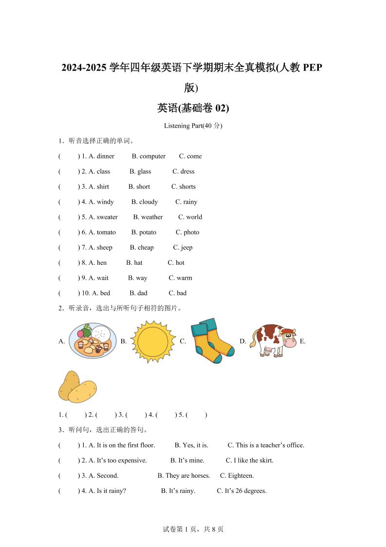 用途 | 主要作为2024-2025学年四年级学生英语下学期期末复习检测工具,帮助学生检测阶段学习成果,适应期末考试节奏,符合《义务教育英语课程标准(2025年版)》对学生语言运用能力、核心素养培养的要求。 |