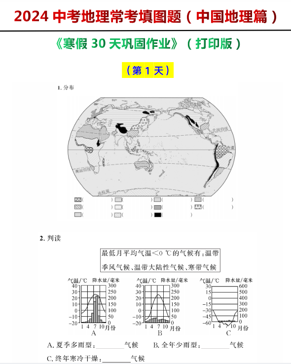 | 一键快速保存!2024中考地理常考填图题(全为中国地理篇)寒假冲刺必刷!高清图卷+答案详解,下载即练,助你轻松攻克填图难关,冲刺地理满分不是梦! | |