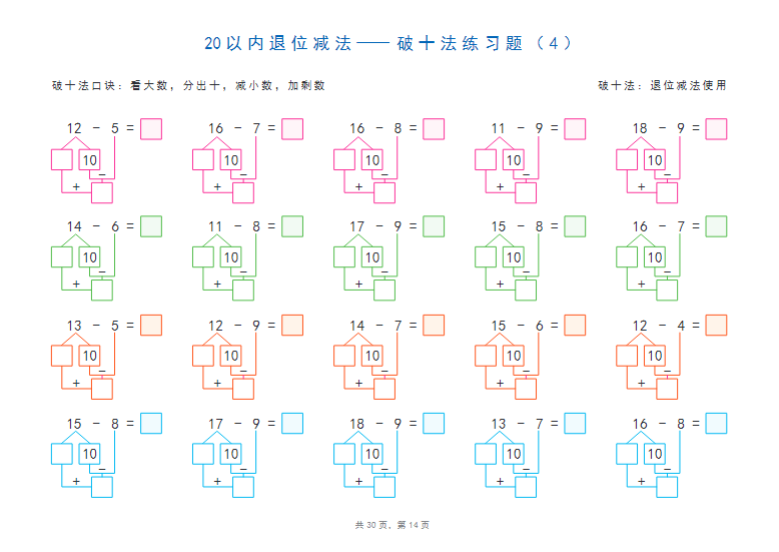 | 20以内加减法之凑十法、破十法、平十法图解练习题(PDF可打印版) | |