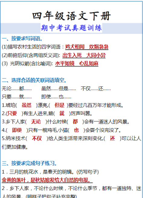 | 四年级语文下册 期中考试真题训练(完整版) | |