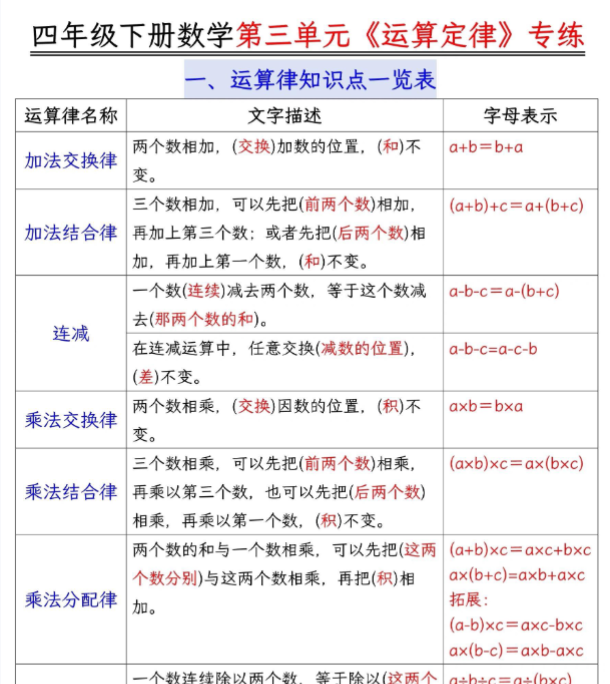 | 【限时可打印】四年级运算律专项训练,立即一键保存高清版+答案,数学逆袭就这么简单! | |